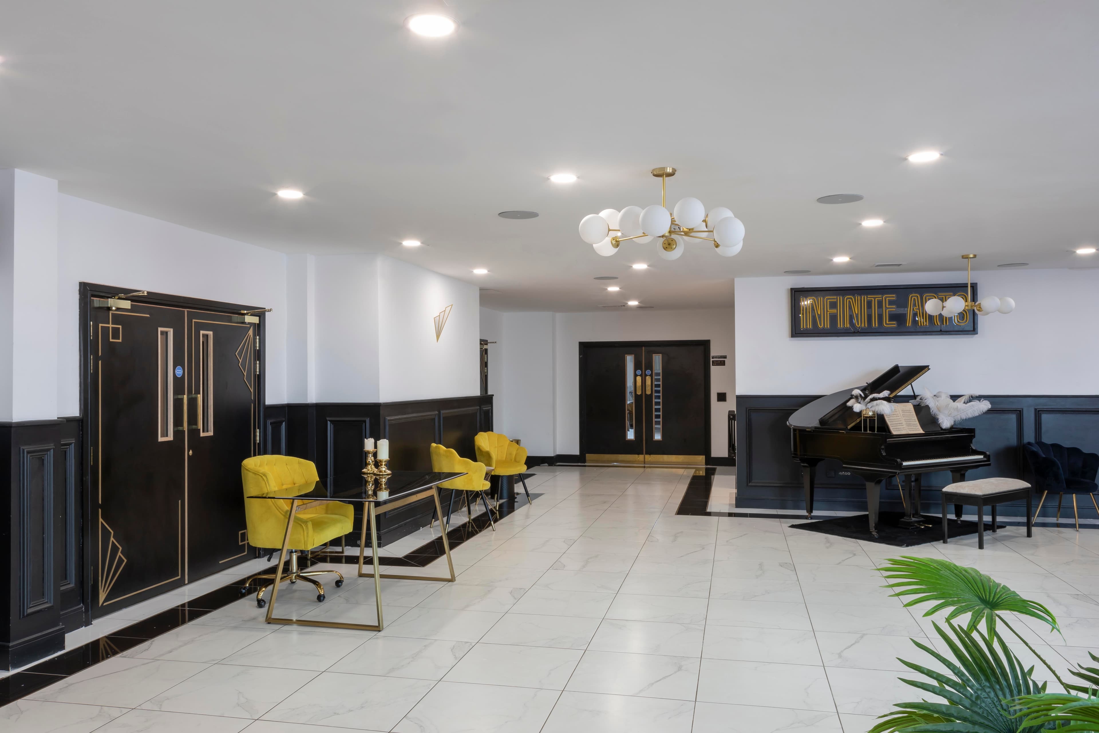 The combined studios are a professional and adaptable space ideal for corporate meetings, seminars, and presentations. This space can comfortably accommodate medium sized audiences, making it perfect for panel discussions, training sessions, and keynote speeches. Each of our two studio spaces measures 13m x 13m and can be used individually, or combined into one large (26m x 13m) venue for larger events. The spacious entrance is tastefully decorated in an Art Deco style and provides an elegant meet-and-greet space in which to gather. The combined studio is completed to a sophisticated specification to meet all your audio/visual needs.