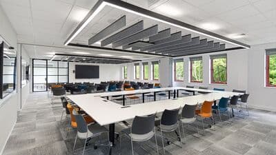 co//lab 2 can be separated to create a smaller space for between 18 to 48. The room comes fully equipped with state-of-the-art technology, including ceiling-mounted microphones, enabling full hybrid meeting capability as standard.