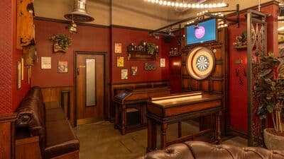 Semi-private event space for 37-50 guests, with three oche's & a Gamesmaster. Perfect for team building events and work socials.
