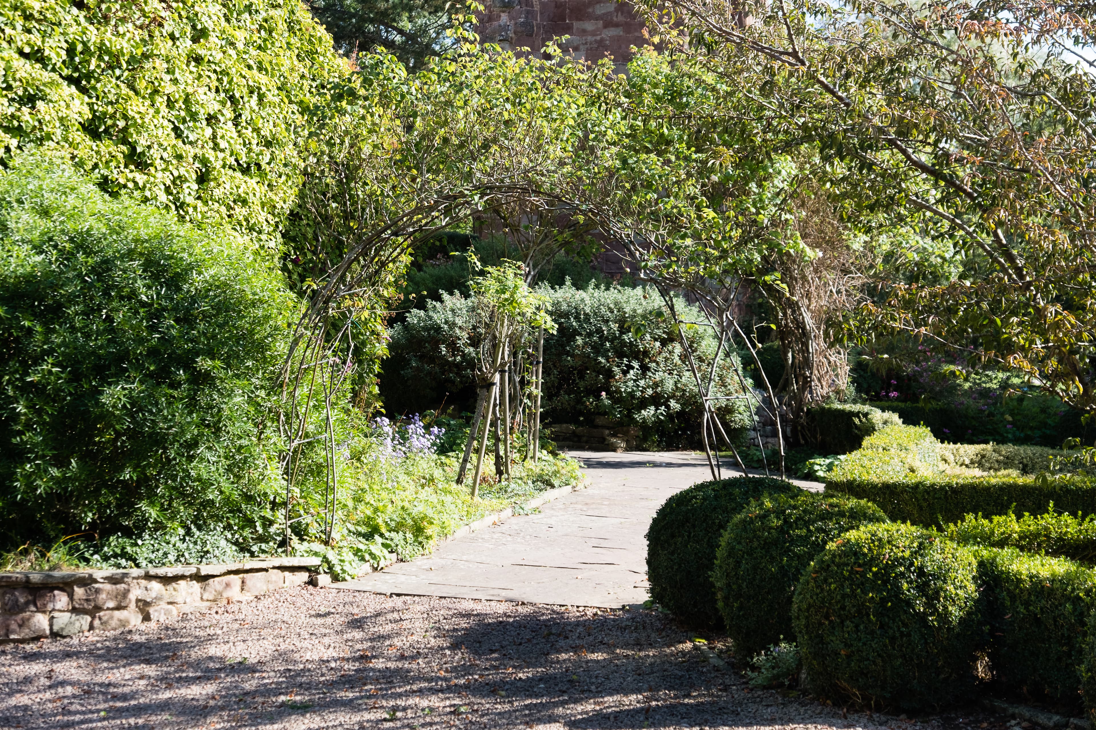 The romantic ruins of a restored 12th century castle and 16th century manor house on the banks of the River Wye form the perfect backdrop for the gardens including herbaceous borders, beds of sweetly scented old fashioned roses, gravel gardens and shrubberies. The two acre gardens are surrounded by a dry moat which leads down to the river Wye which has ducks, swans, kingfishers etc and even otters have been recently spotted.