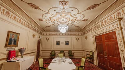 The Great Hall, which is the most impressive of the rooms, is decorated with three glittering golden chandeliers, which hang from an ornate ceiling. It is a bright and airy space with floor-to-ceiling windows with access to an outdoor space for those all-important wedding photos [the venue is located near the remains of the original London wall built by the Romans in the 3rd century].