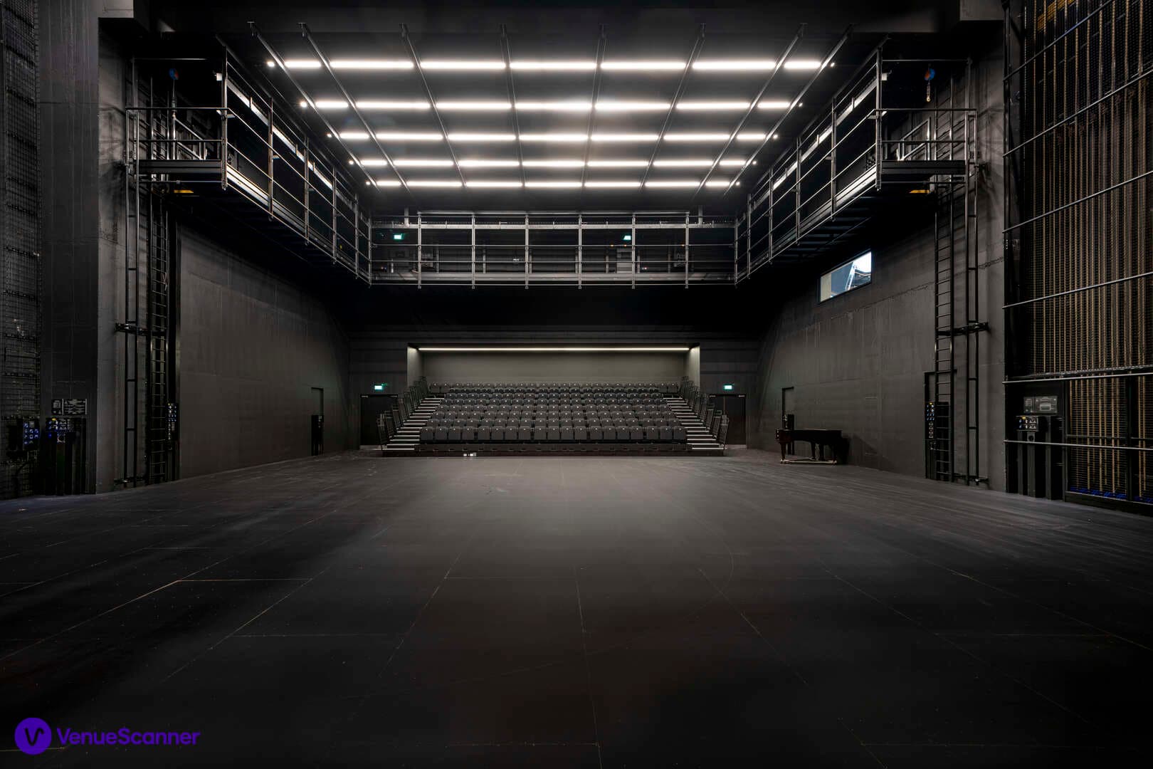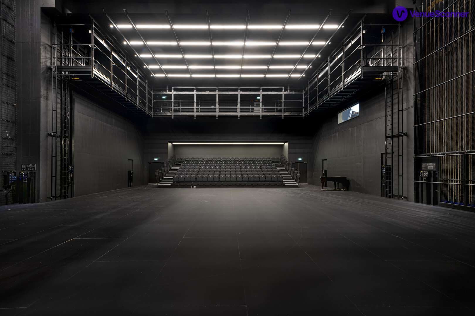 The Production Studio is a blank canvas and can be a productive technical theatre space, an engaging conference or training space, and can transform into a magical hospitality space. With a full height fly tower and a stage space to match London’s largest theatres, the Production studio offers a technical space on a dry hire basis in which to rehearse and produce performances. It is incredibly versatile and can also be used for filming and product launches/brand activations.