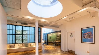 Serving seasonal snacks and small plates from our acclaimed wine bar downstairs, our stylish private dining room - AKA the 'Green Room' - is the ideal space for intimate lunches and dinners for up to 30 guests. Flooded with natural light and equipped with all the AV you'll need for daytime meetings and away days, the space comes to life in the evening with its constellation of exposed industrial bulbs, dramatic artwork and sliding glass panelled doors. The Green Room also has its own lobby area overlooking Carousel's double-height atrium, complete with built-in banquette seating; perfect for welcome drinks, break out meetings and catch ups between courses with old friends.