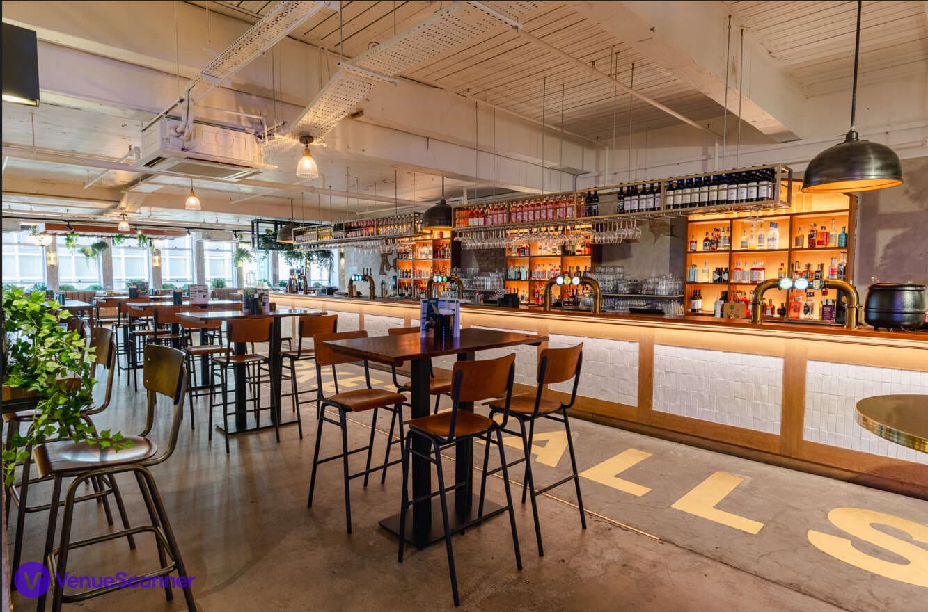 The classic exposed brick walls add charm and character to the venue, complemented by large windows that flood the space with natural light. The high ceilings create an open and airy atmosphere making Market Halls Oxford Street flexible and inviting. We have a mixture of seating across the venue from comfy booths, large group tables and hightop tables with bar stools. You can find a selection of greenery throughout the venue to bring the outside in.