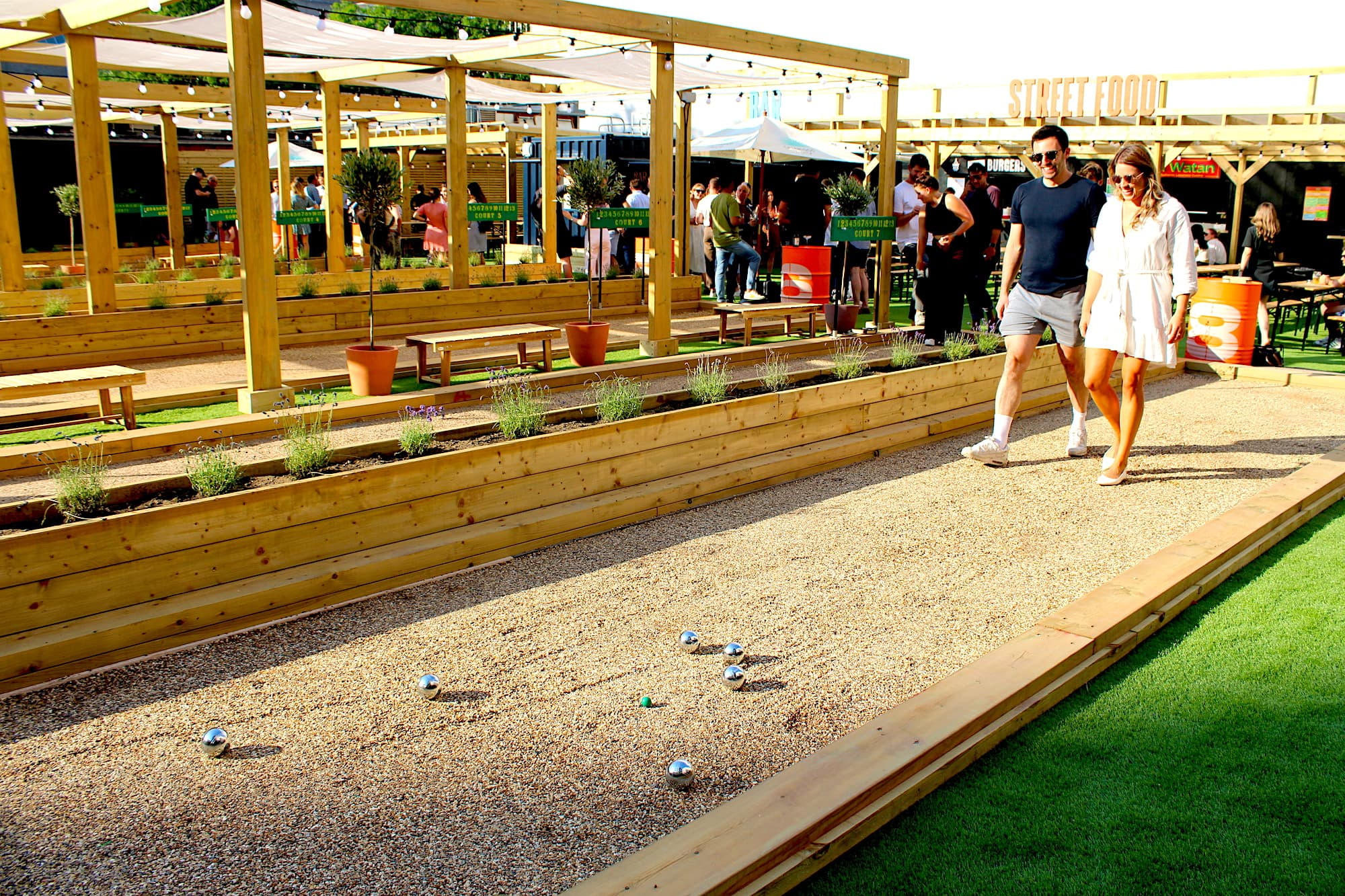 Our pétanque lanes make for an exciting entry to our venue, where you can also find 2 bars and 2 Street Food vendors, serving up delicious food & drinks for your guests.