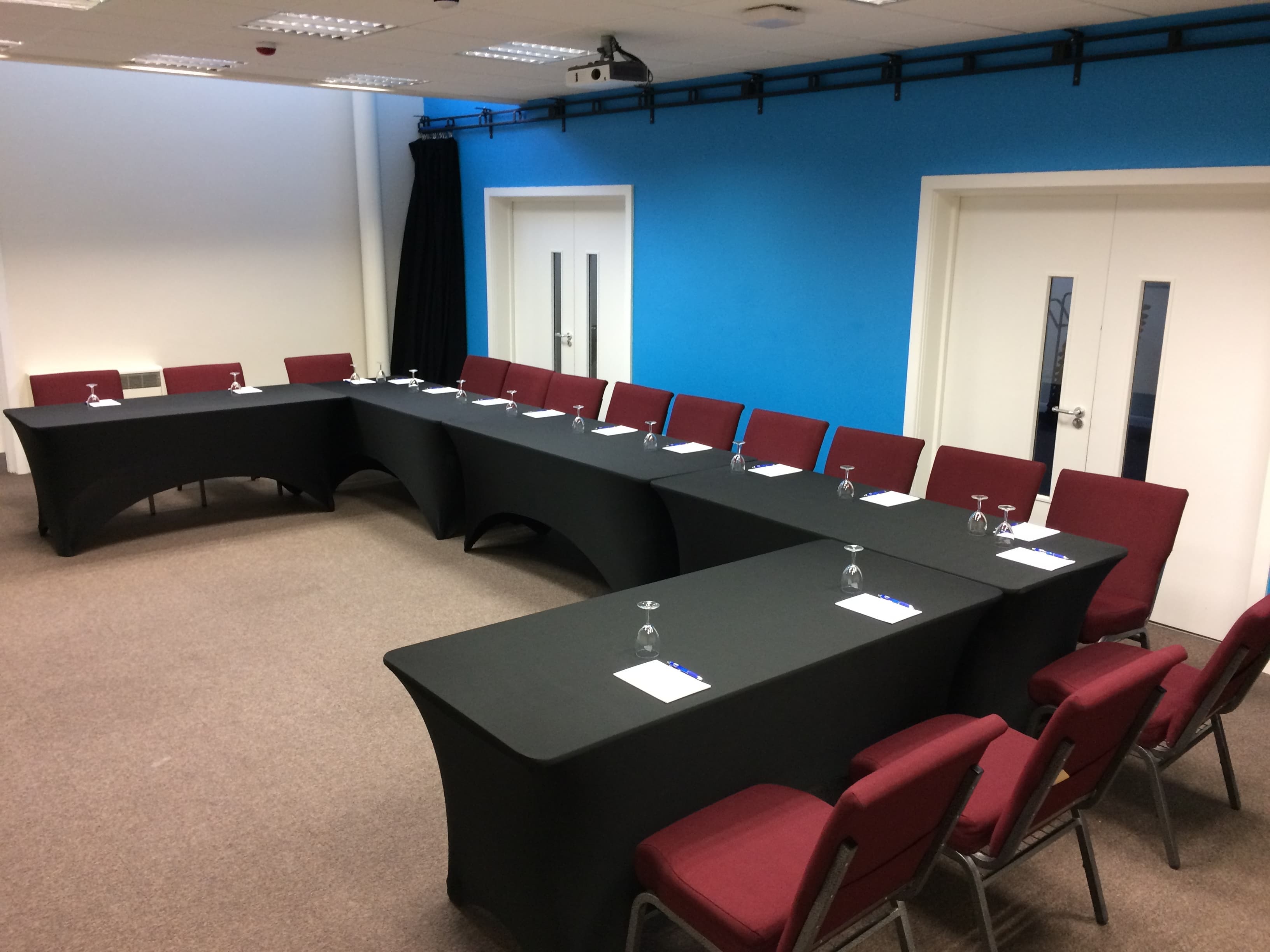 Ideal for training events, this room can offer a capacity of up to 30 people in theatre style and 16 people in boardroom or U shape style. High level windows provide plenty of natural day light. 42” LCD TV available, portable PA, Laptop PC, Flip charts and pens. 6.5 metres x 12.5 metres