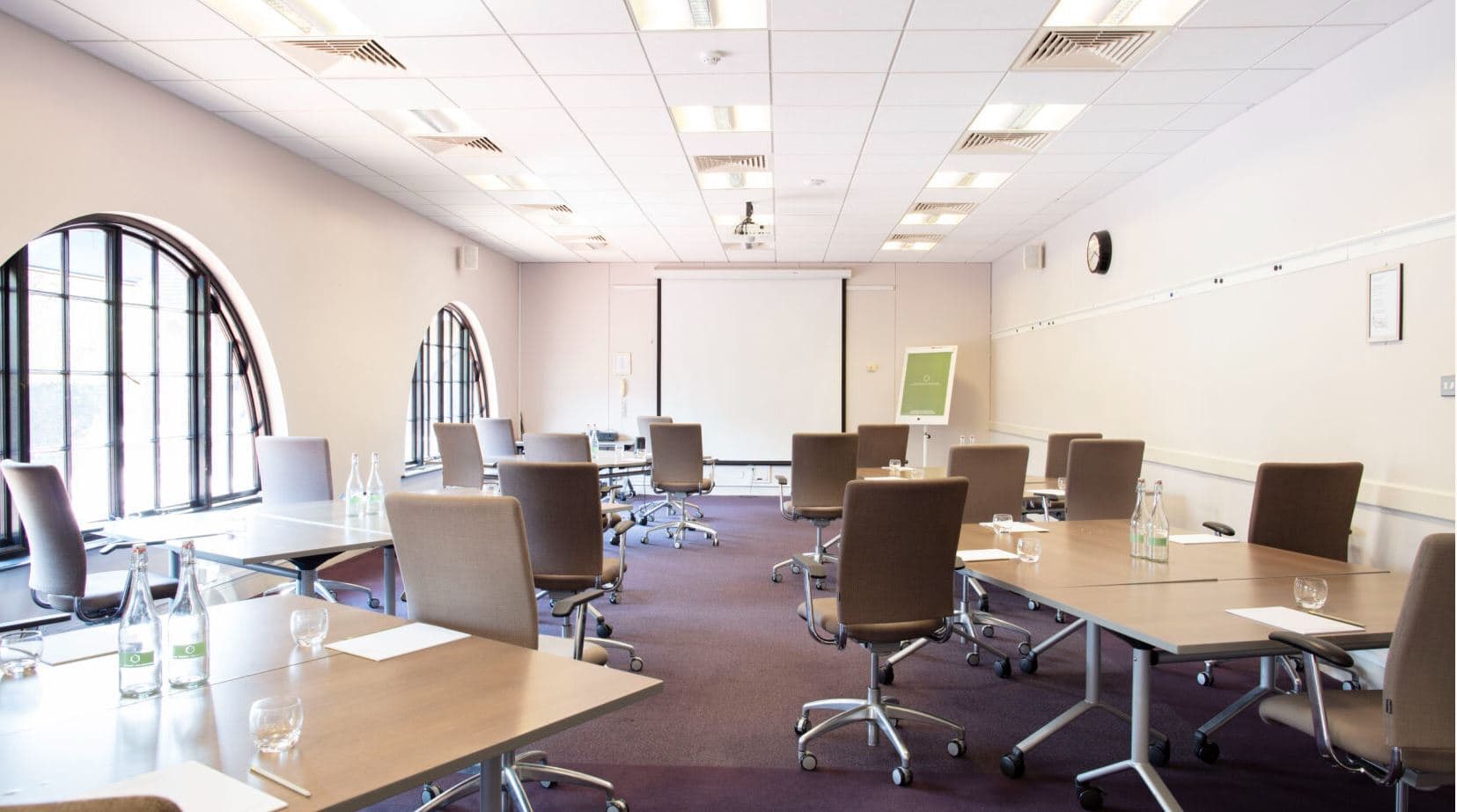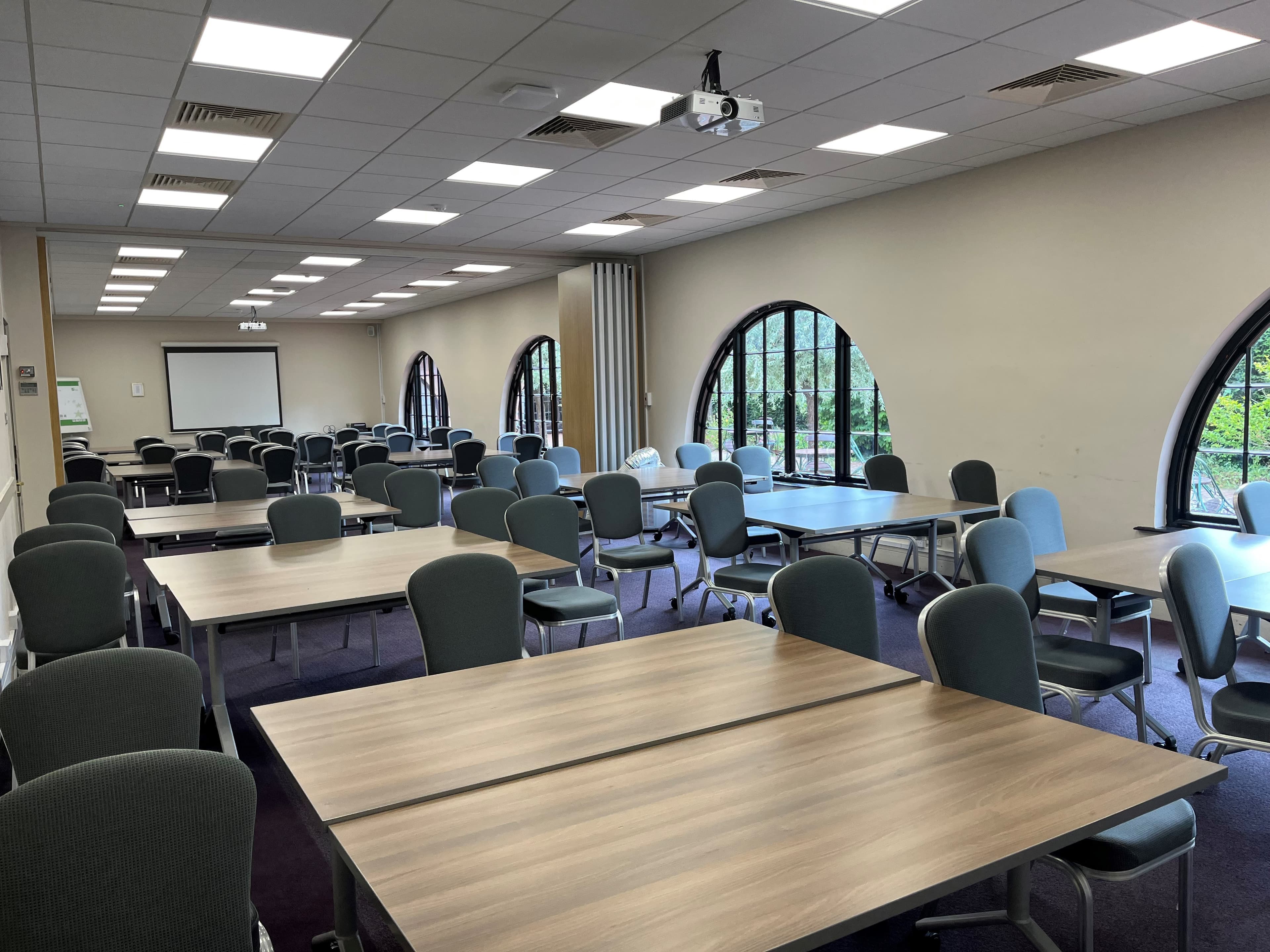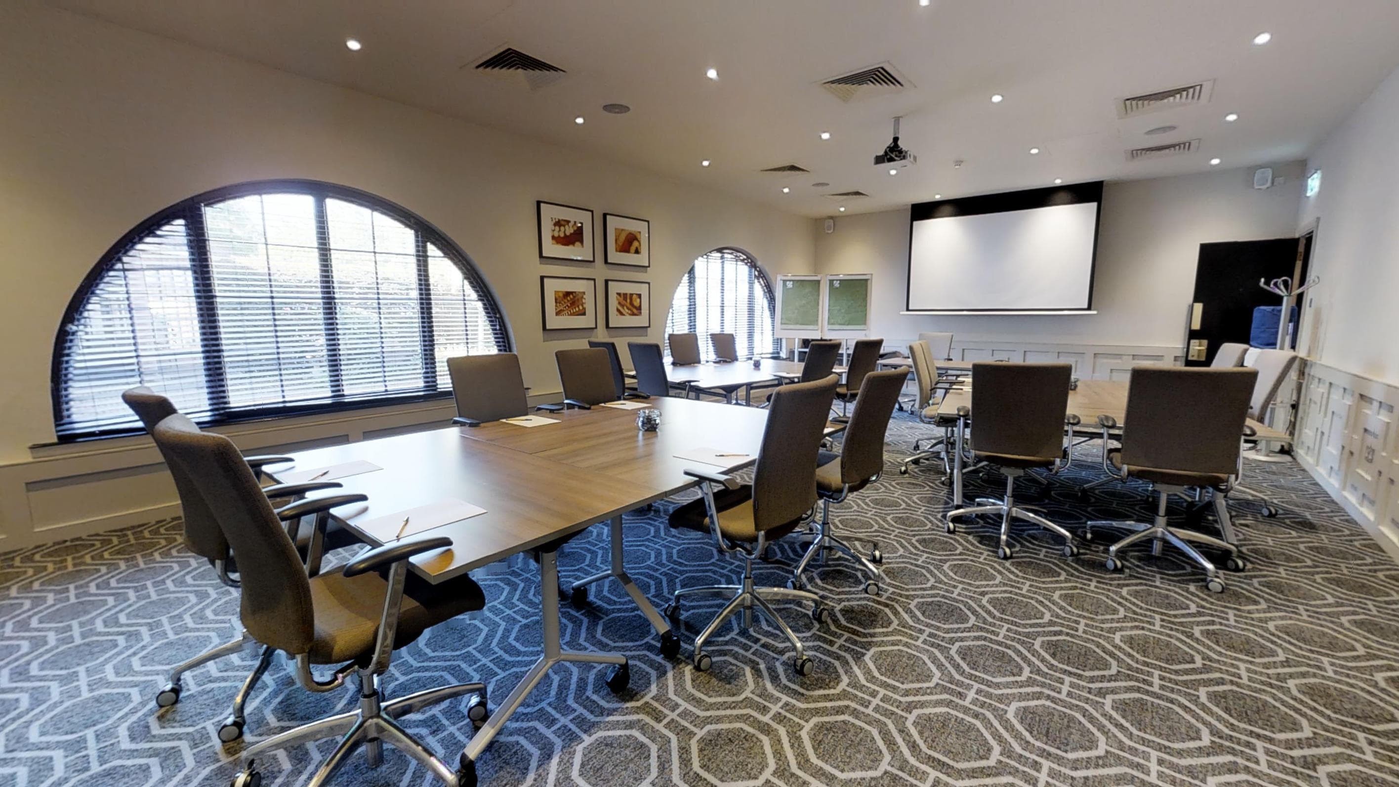 Ornate windows flooding in natural light with full projection facilities in each side of the space.