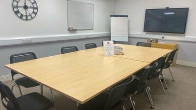 The room seats up to 40 people theatre style and is equipped with the latest interactive white board and projection equipment. There is a PC as well as a convenient facility for connecting a laptop to the AV system. This room is designed for classroom based training including technical IT based sessions and will seat up to 20 in a U-Shape layout.