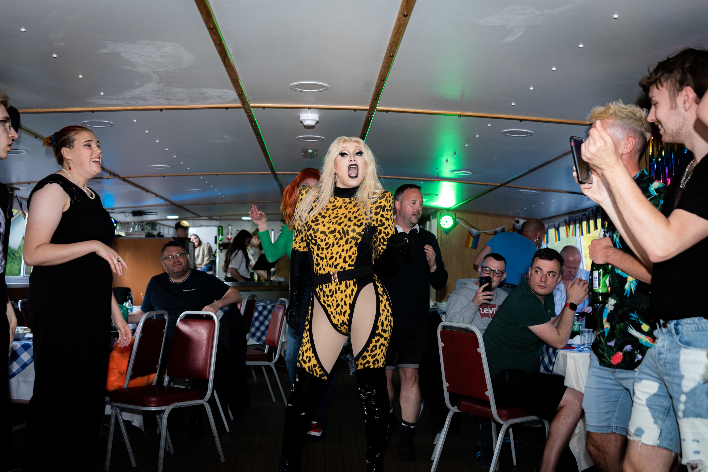 Captain James Cook offers enclosed seating for 80, a heated lounge, spacious top deck, dancefloor, hot/cold menus, three toilets, background music, and a fully stocked bar.